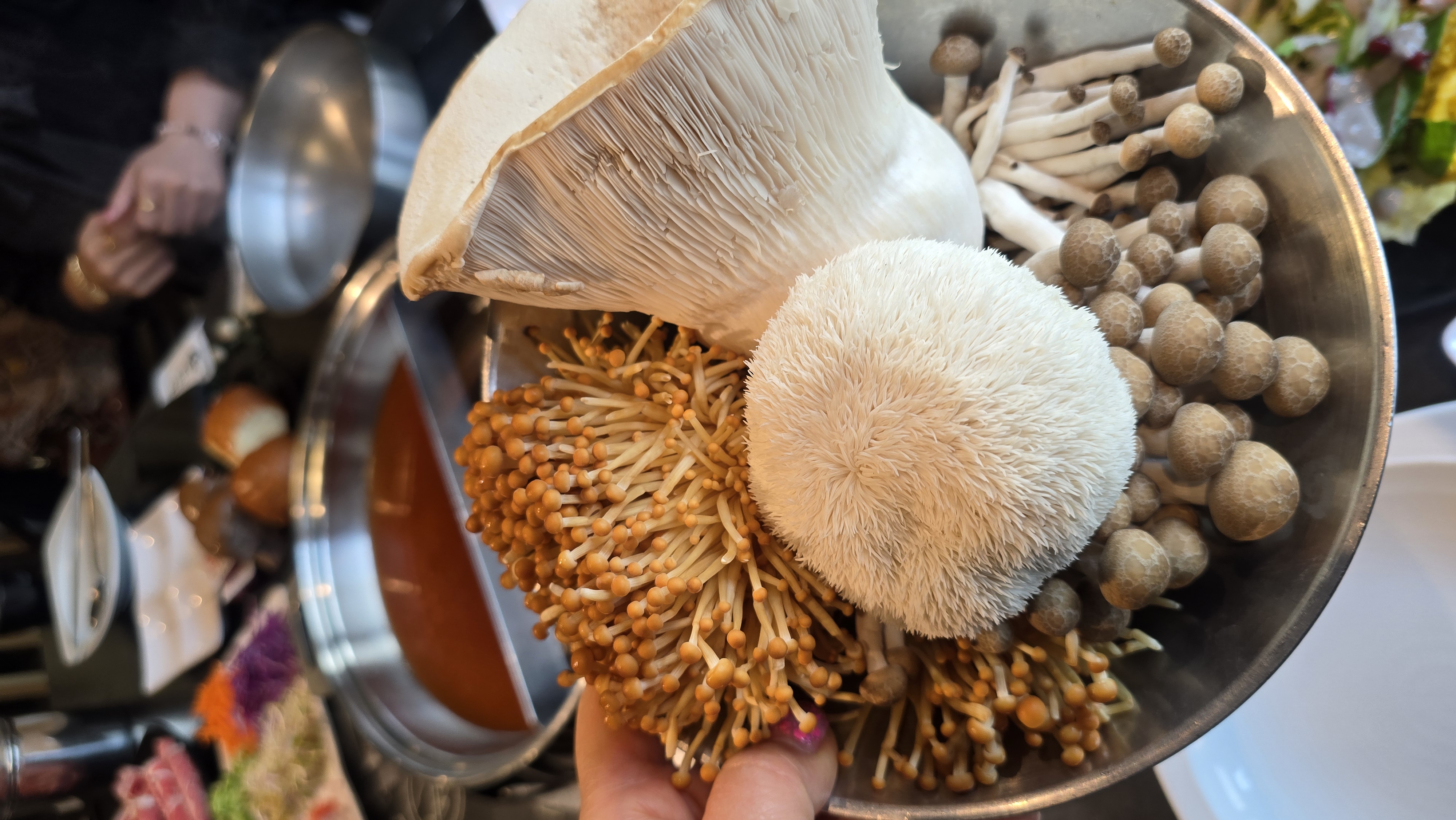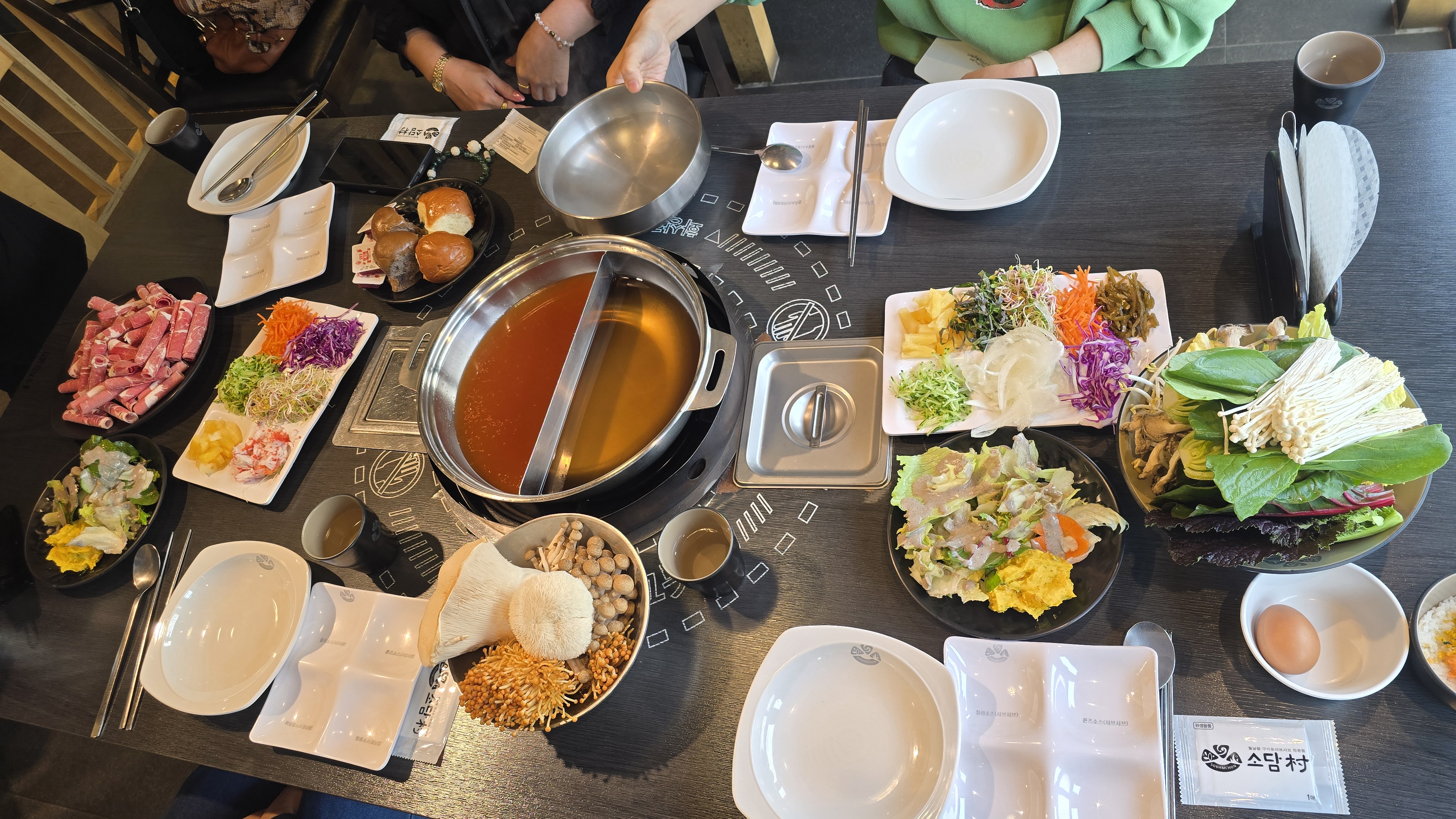 소담촌의 가장 큰 장점은 신선함입니다. 평소 집에서 챙겨 먹기 힘든 다양한 만가닥버섯, 황금팽이버섯 등 건강한 버섯들이 한가득 준비되어 있어 보양식을 먹는 기분이 듭니다. 각자 취향에 맞는 4가지 소스(칠리, 폰즈, 땅콩, 라임)를 곁들여 먹다 보면 어느새 건강해지는 기분이 듭니다.
