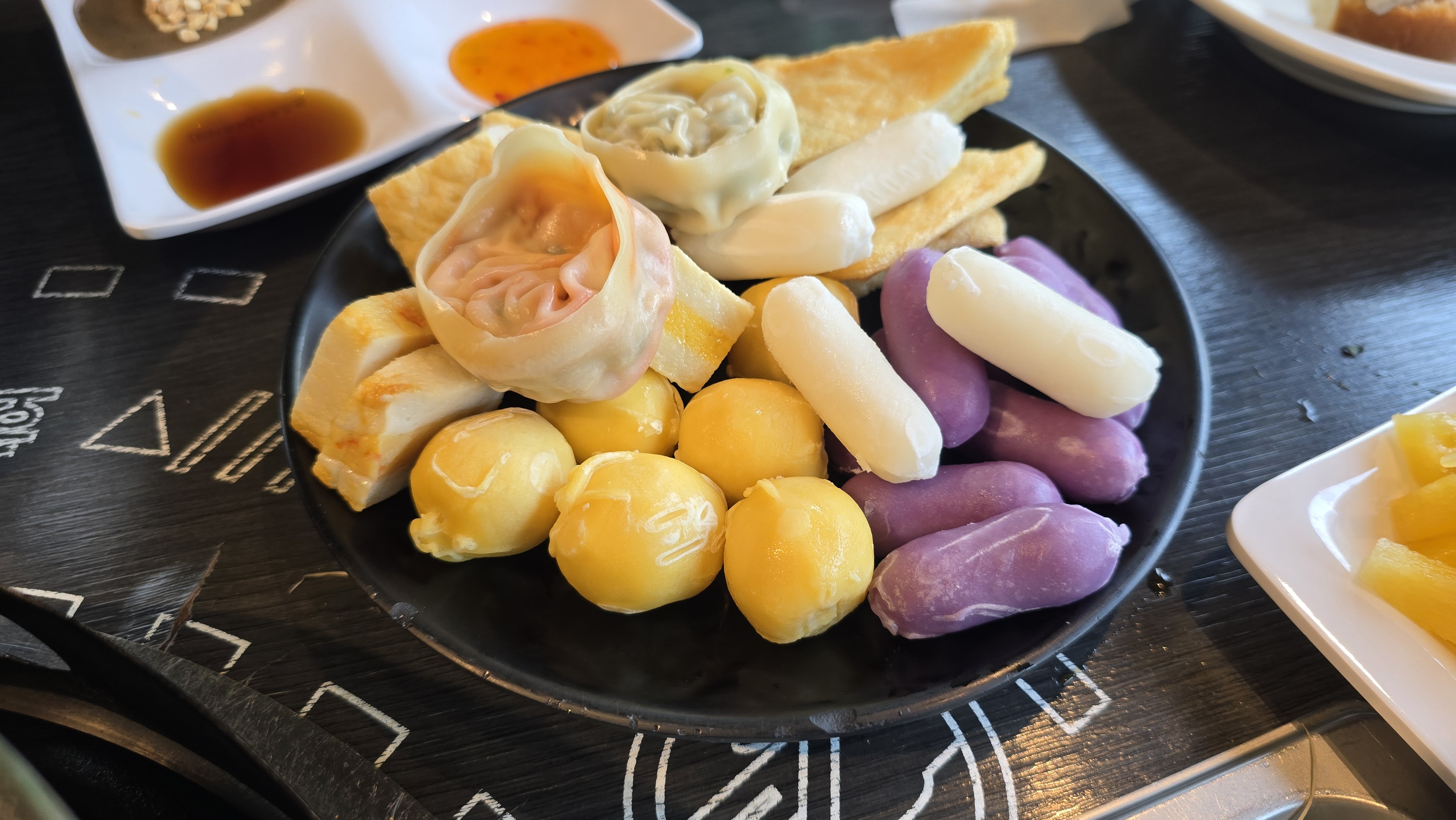 소담촌 셀프바에서 가장 인기가 많은 것은 단연 떡사리입니다. 특히 고구마치즈떡과 쫀득한 감자떡사리는 금방 소진되니, 육수가 끓기 시작할 때 미리 넉넉히 챙겨두는 센스가 필요합니다.