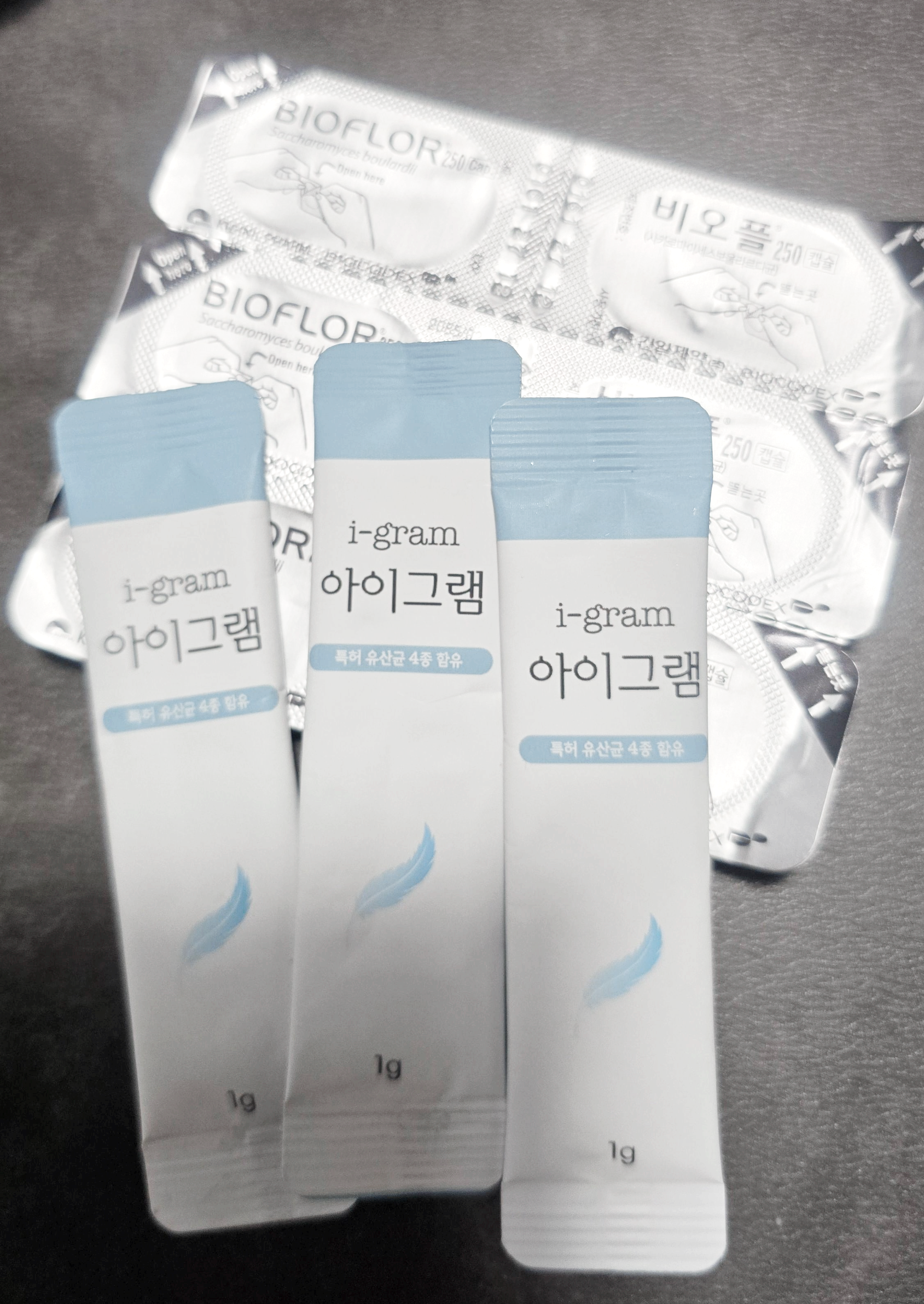 "저희가족이 요즘 챙겨 먹는 아이템들이에요. 하나는 효모균인 비오플, 하나는 데일리로 먹는 아이그램 유산균입니다!