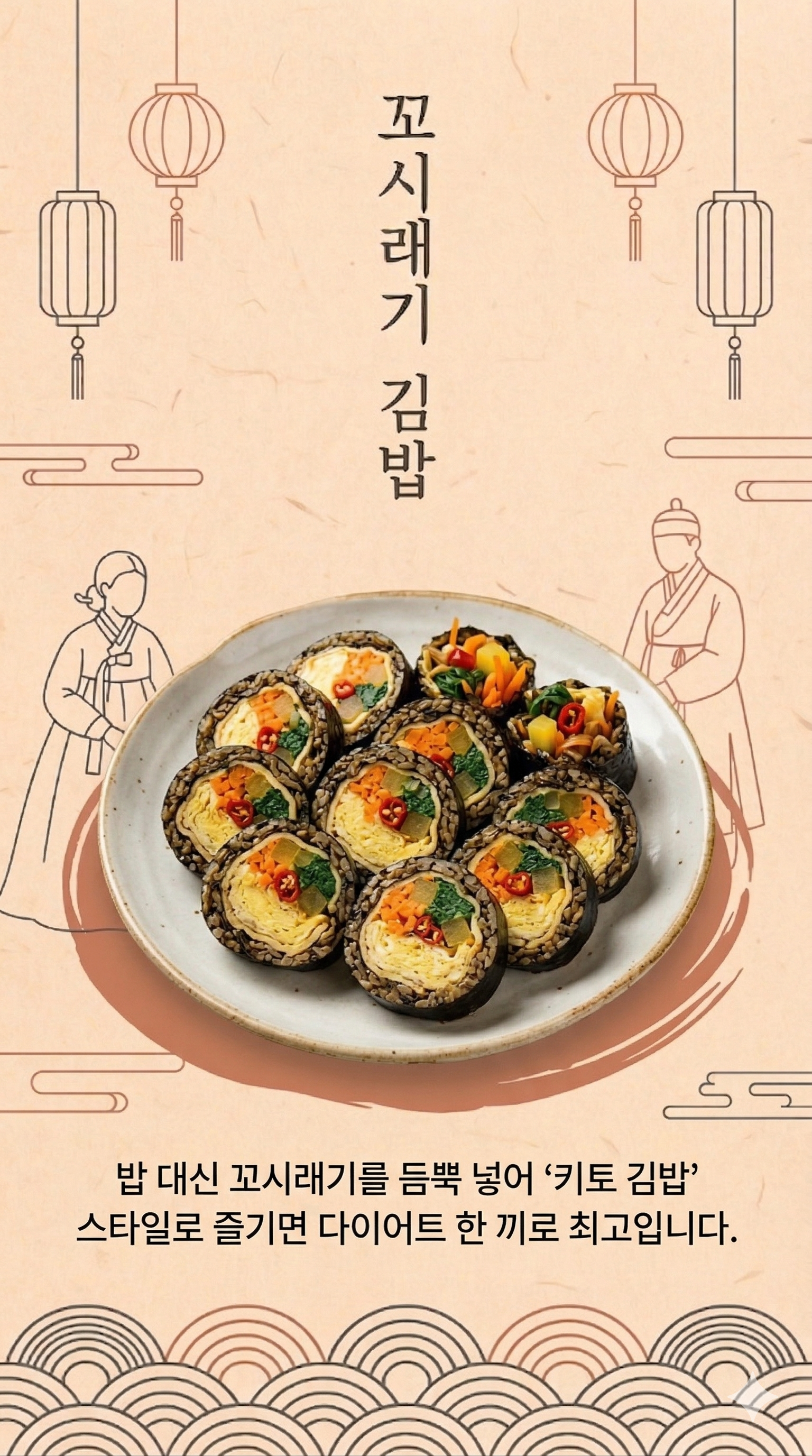 - 꼬시래기 김밥: 밥 대신 꼬시래기! 식단 관리 끝판왕 '꼬시래기 김밥' 밥 대신 꼬시래기를 듬뿍 넣어 '키토 김밥' 스타일로 즐기면 다이어트 한 끼로 최고입니다.