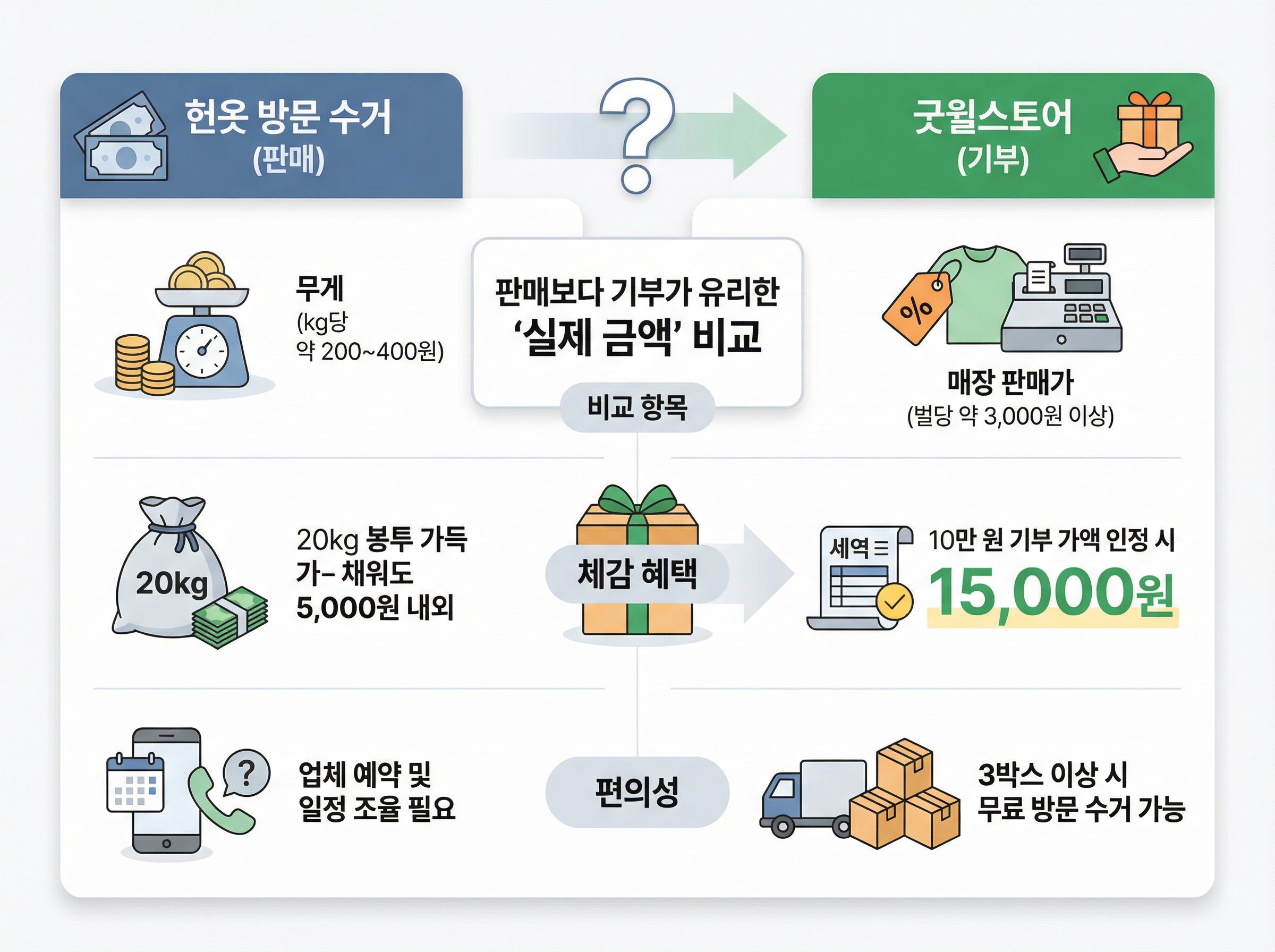 많은 분이 안 입는 옷을 정리할 때 방문 수거 업체에 판매하곤 합니다. 하지만 최근 헌옷 수거 단가는 kg당 200~400원 수준으로 매우 낮게 형성되어 있습니다. 반면, 굿윌스토어와 같은 사회복지법인에 기부할 경우 다음과 같은 경제적 이점이 있습니다.